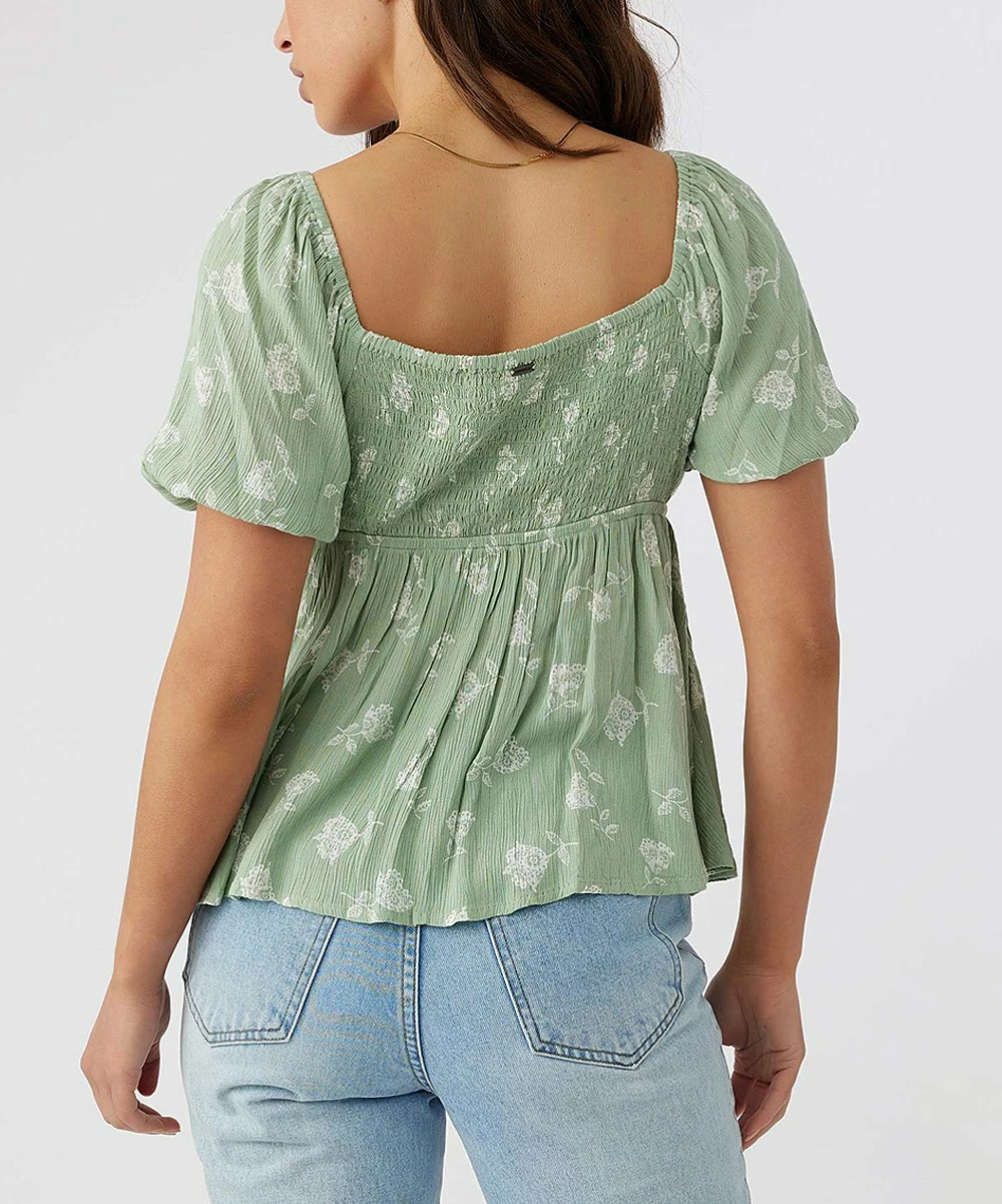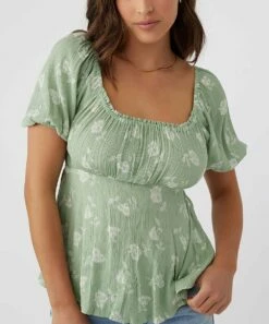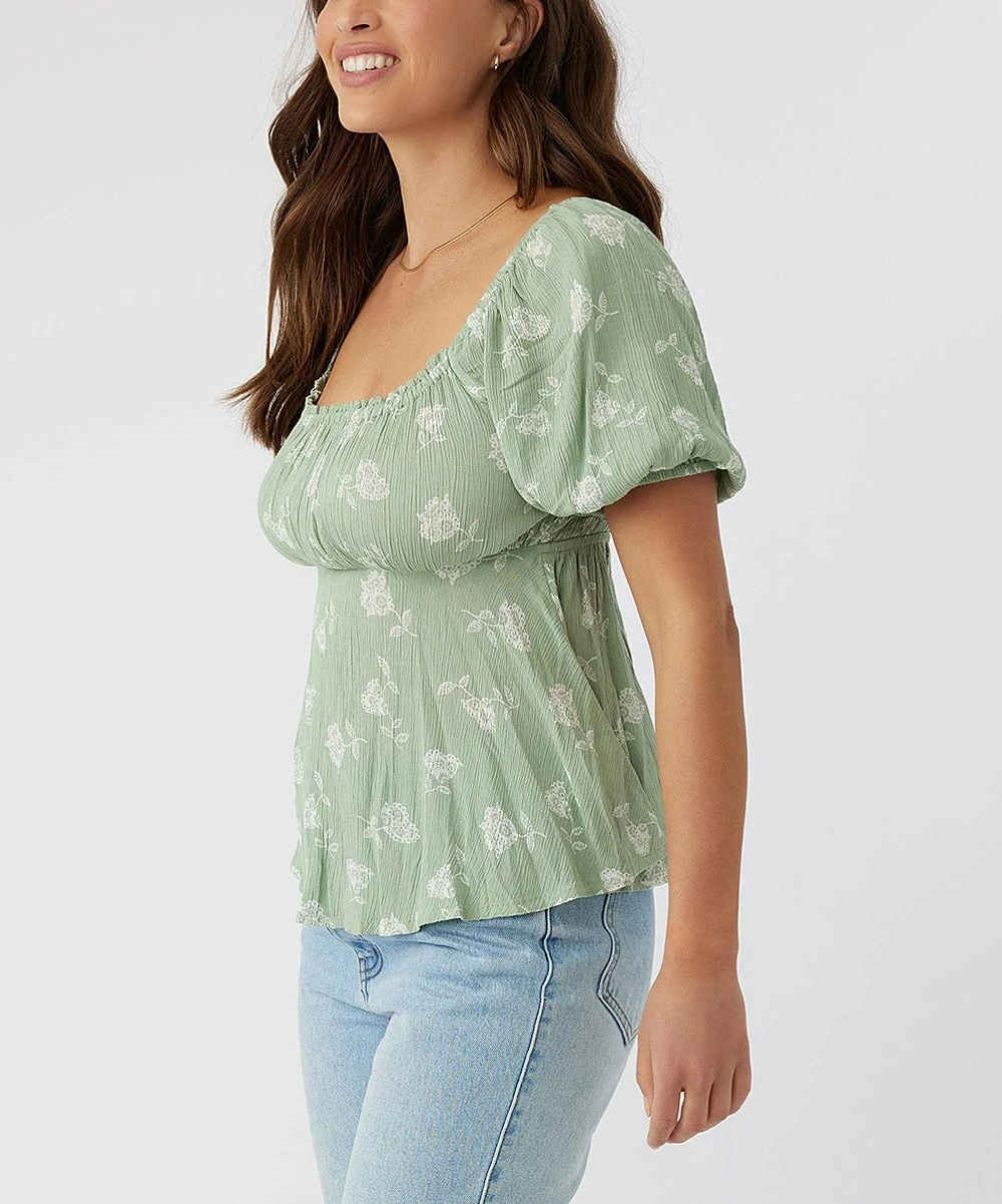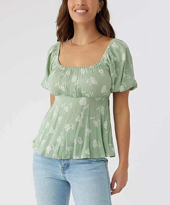 Empire-waist top with short puff sleeves that can be worn over the shoulder or off to the side.