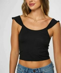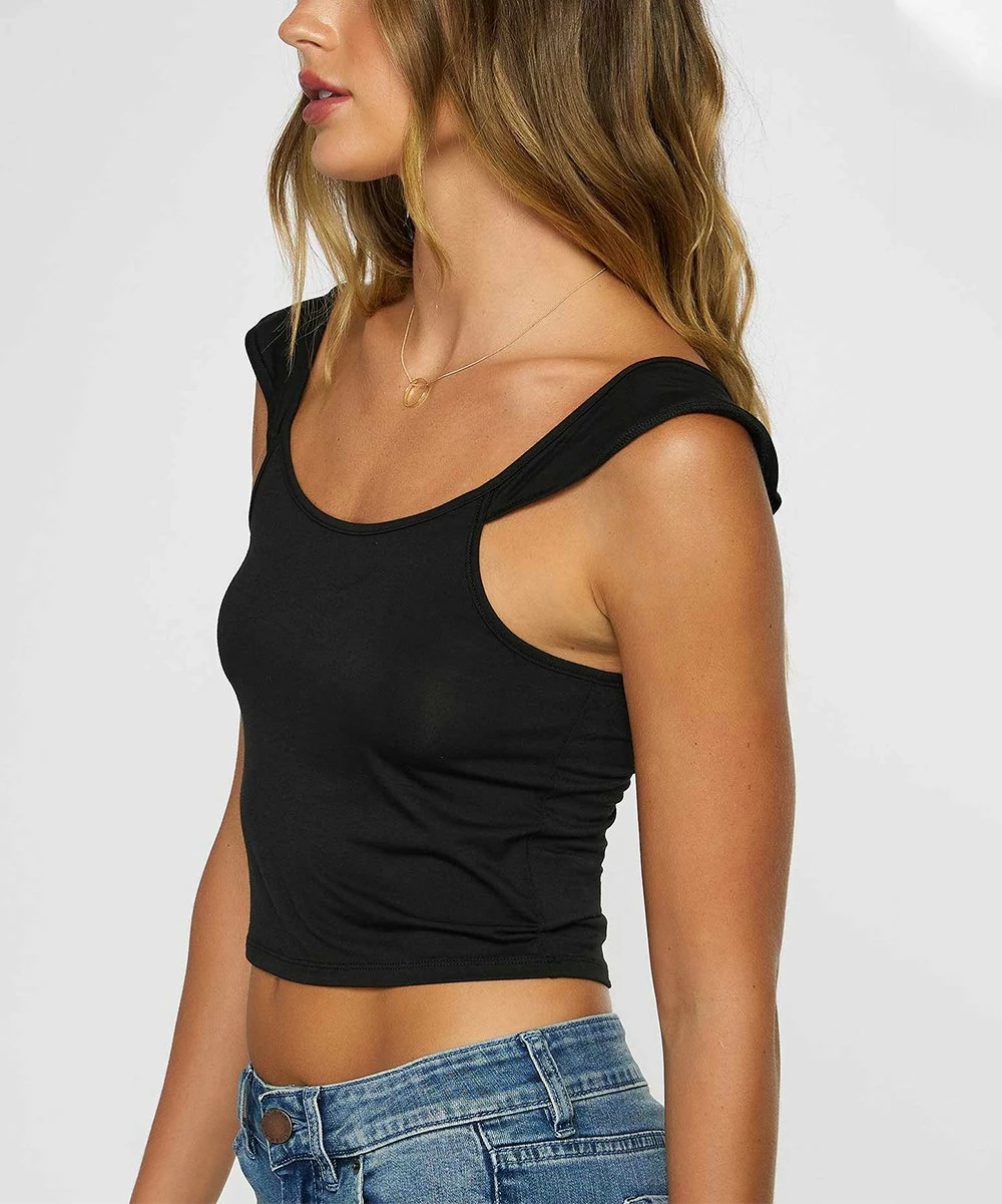 Crop top featuring subtle cap sleeves and comfortable stretch-infused fabric.