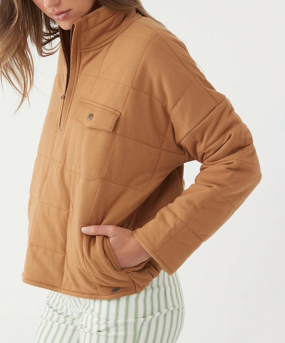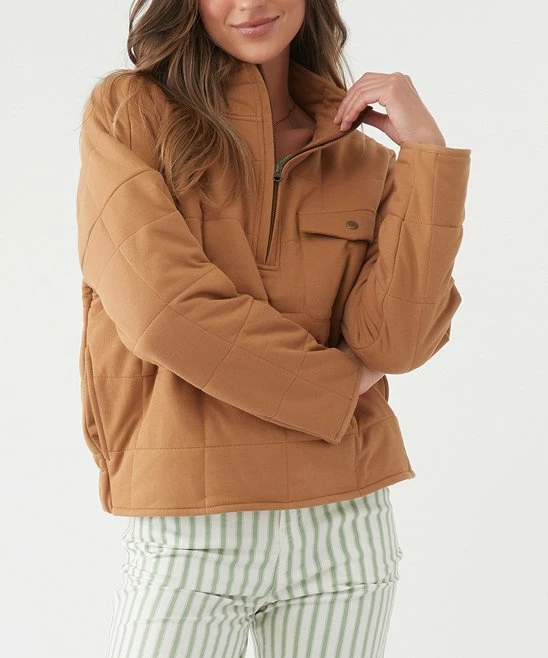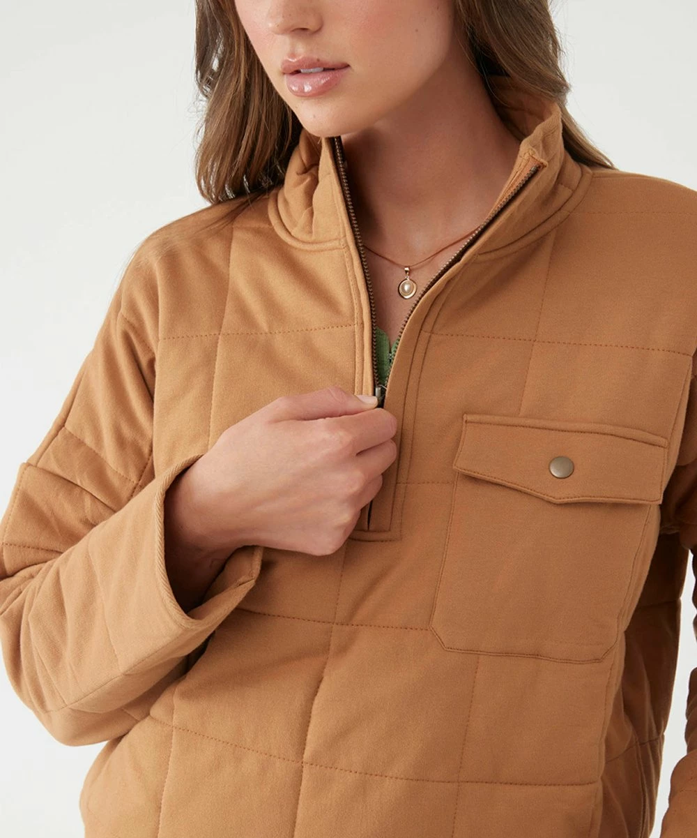 Pullover jacket featuring a quilted design and half-zip closure.