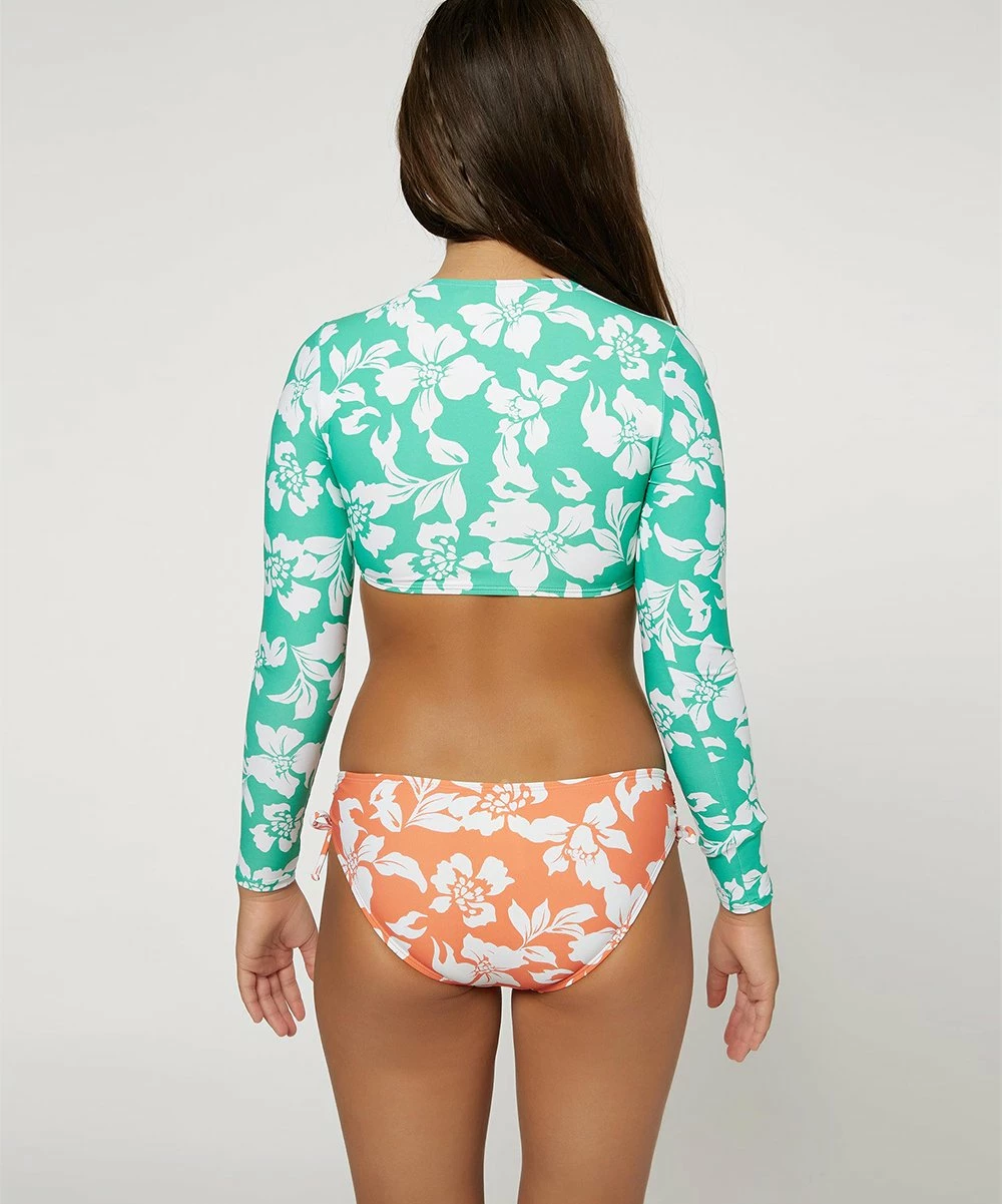 - Includes one kelly green floral long-sleeved cropped bikini top and one pair of hot coral floral bikini bottoms (two pieces total)
