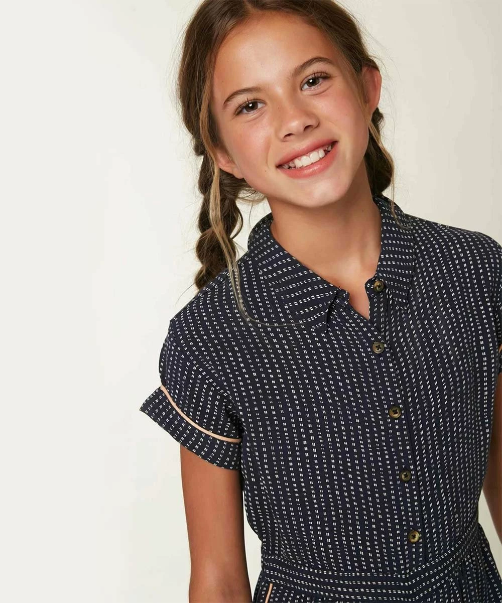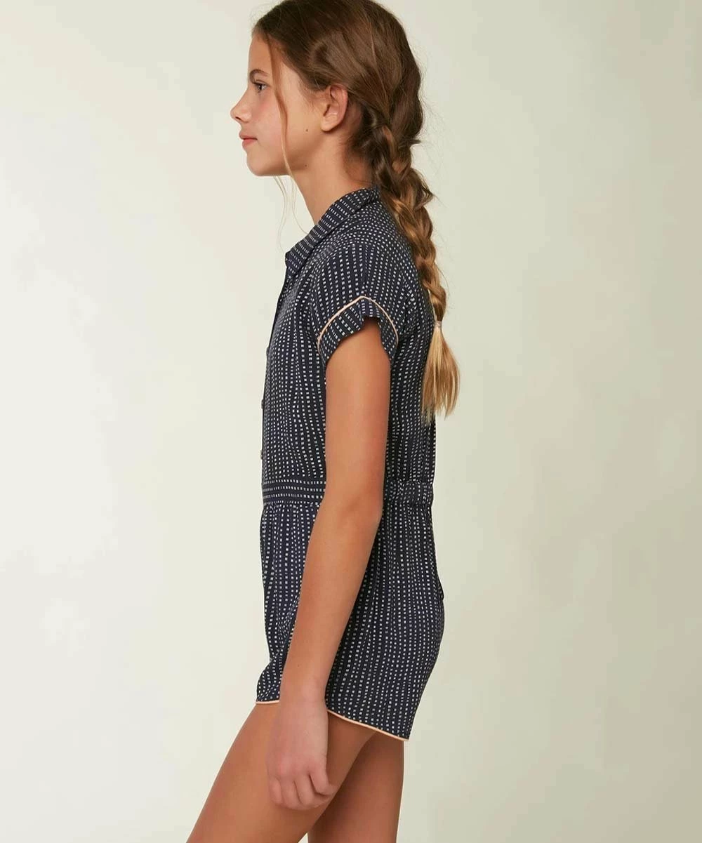 Give their wardrobe a preppy makeover with this snazzy patterned romper sporting a sharp collar and a trend-setting button-front.