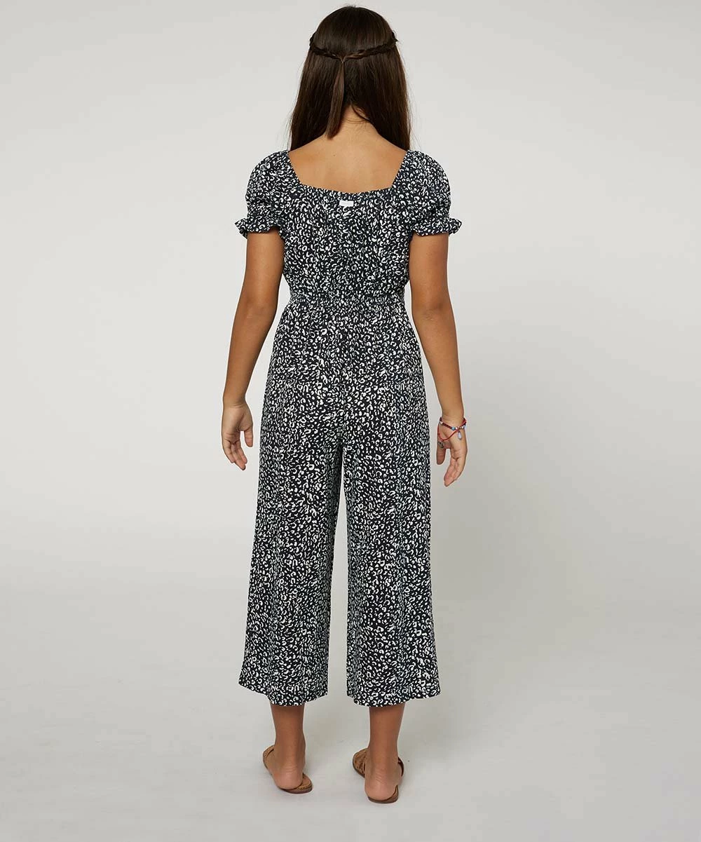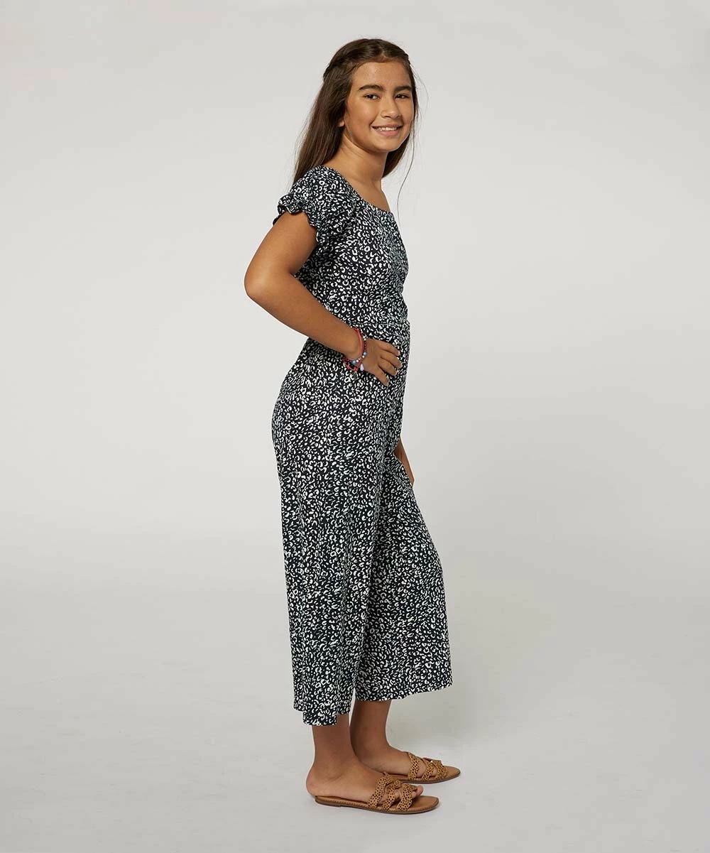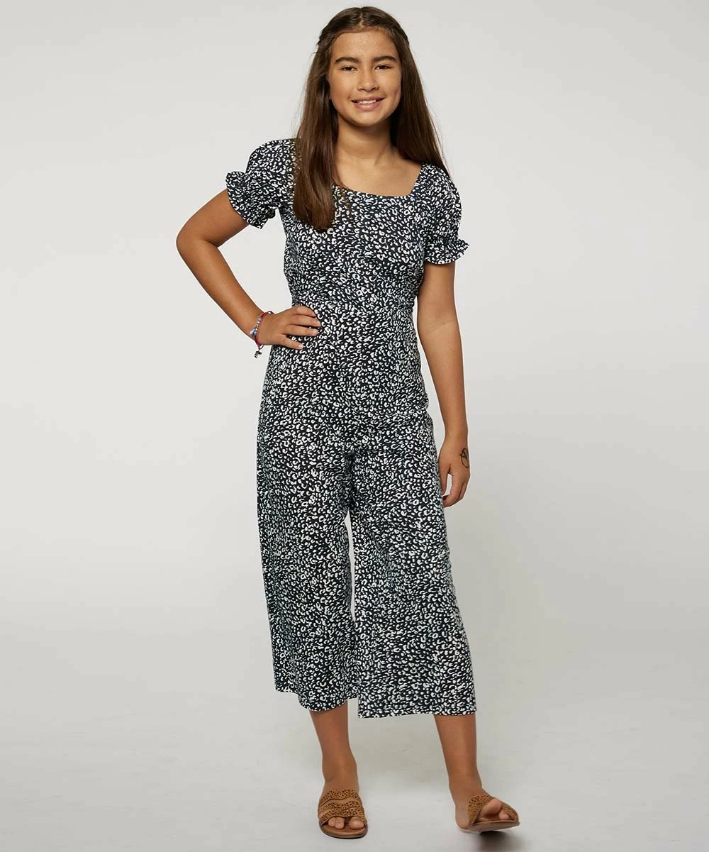 A jumpsuit featuring a cool abstract print and soft materials that make it great for all day play.