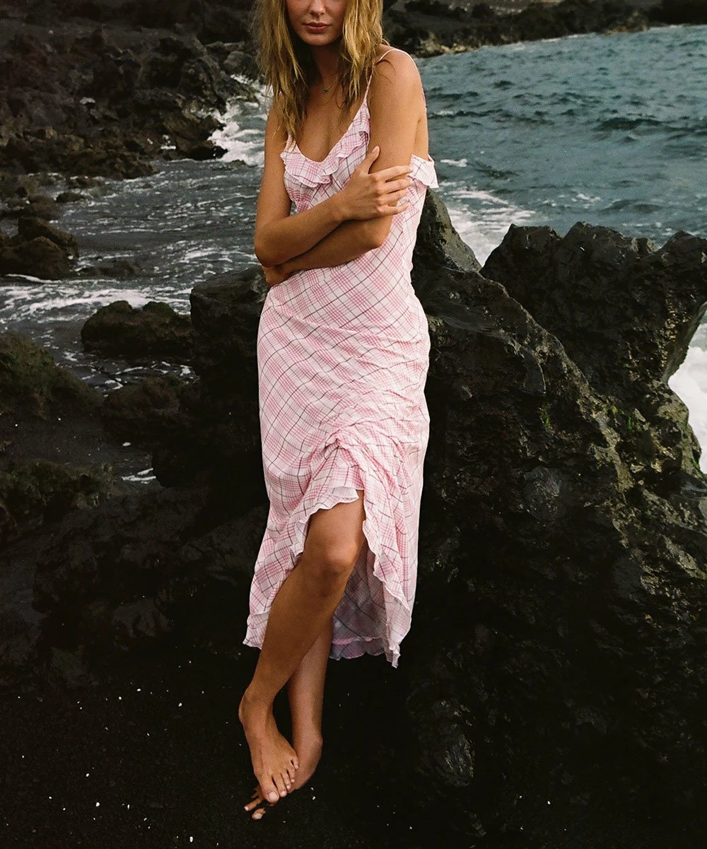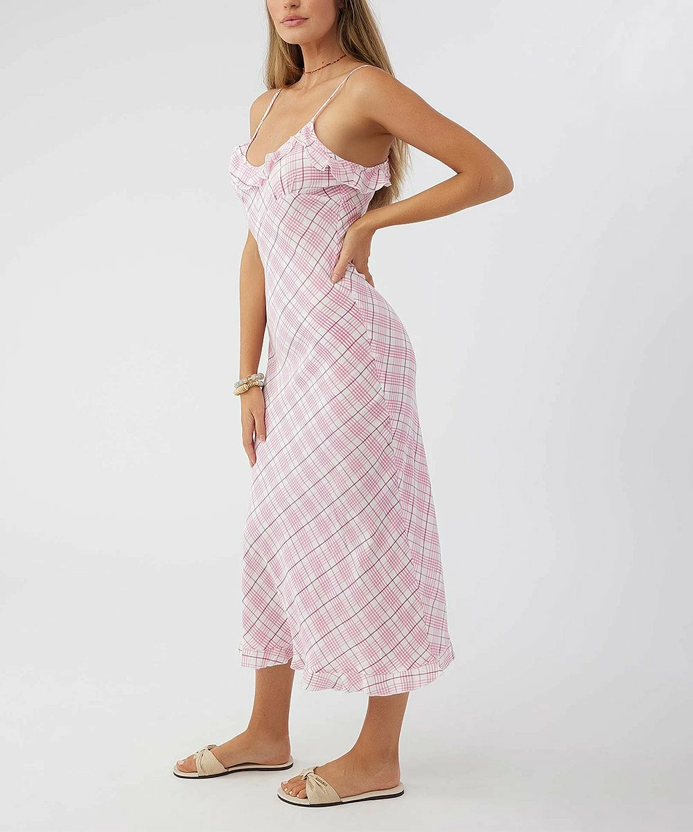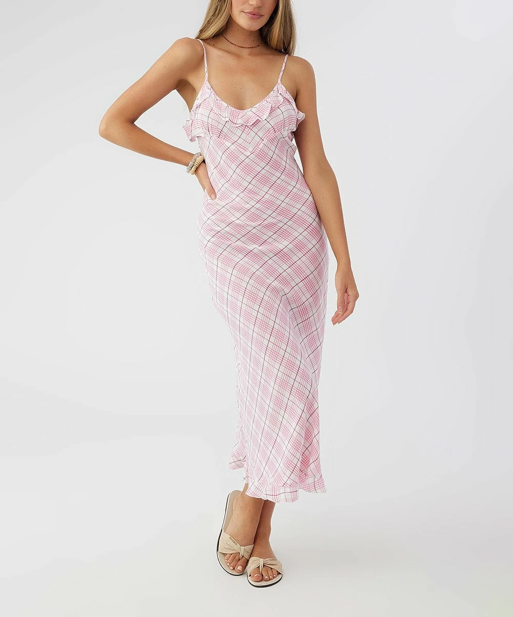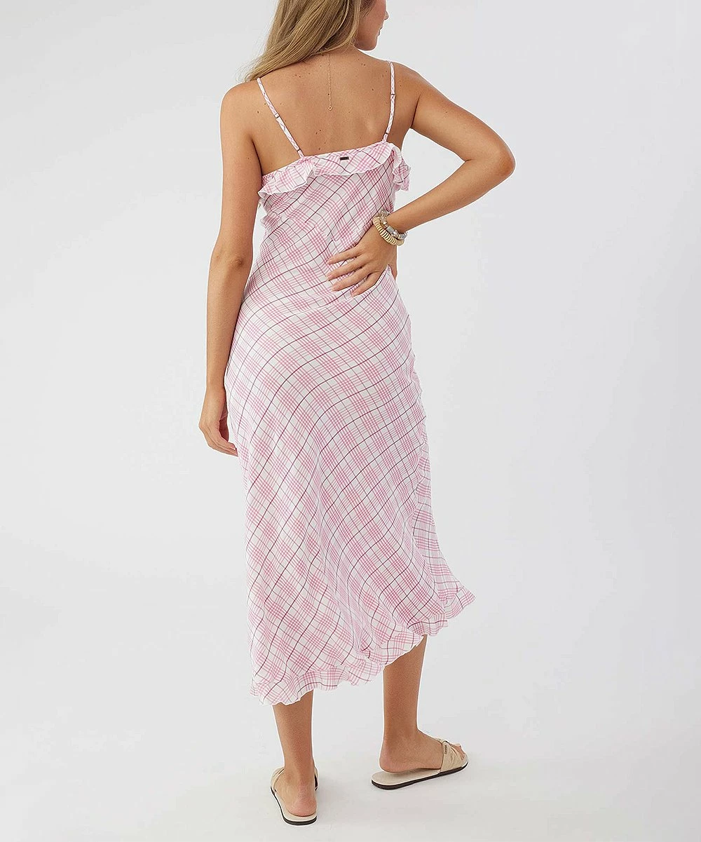 Build up your warm-weather wardrobe with this sleeveless dress that showcases ruffle accents along the hem and neckline, adjustable cami straps and an invisible side-seam zipper.
