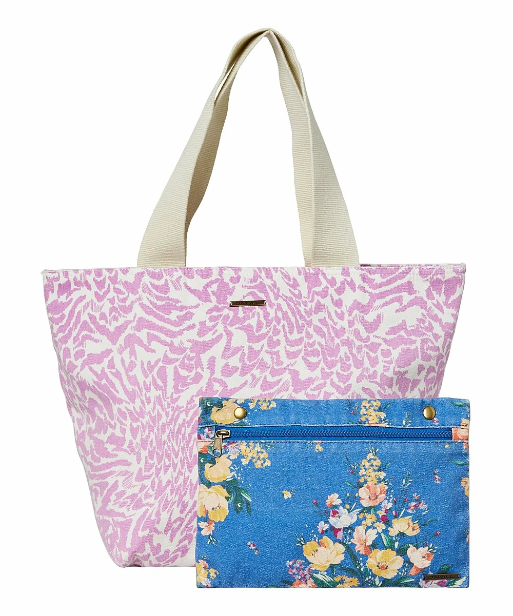 - Includes pink abstract tote and blue floral clutch (two pieces total)