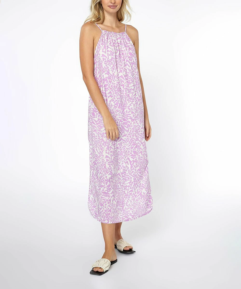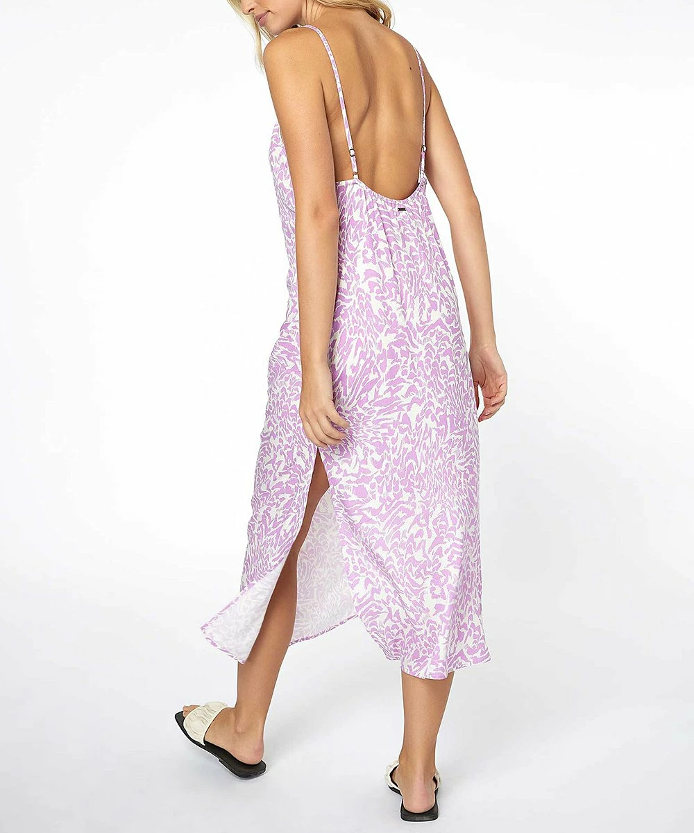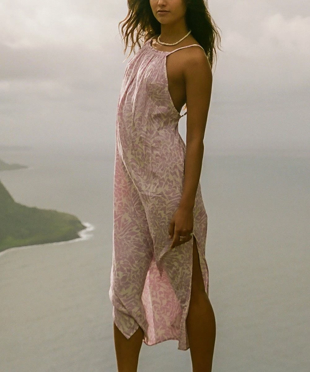 This flowy-fit dress features a sleeveless design with gathered neckline and an open back. Adjustable straps and side slit detail.