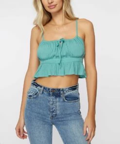 Crop top featuring a playful ruffle hem and thin shoulder straps.