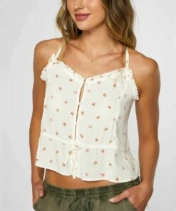 Crop top featuring distinctive cross back straps and playful ruffle accents.