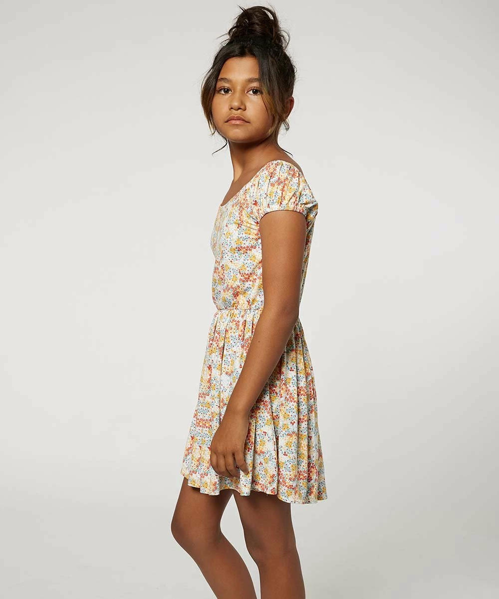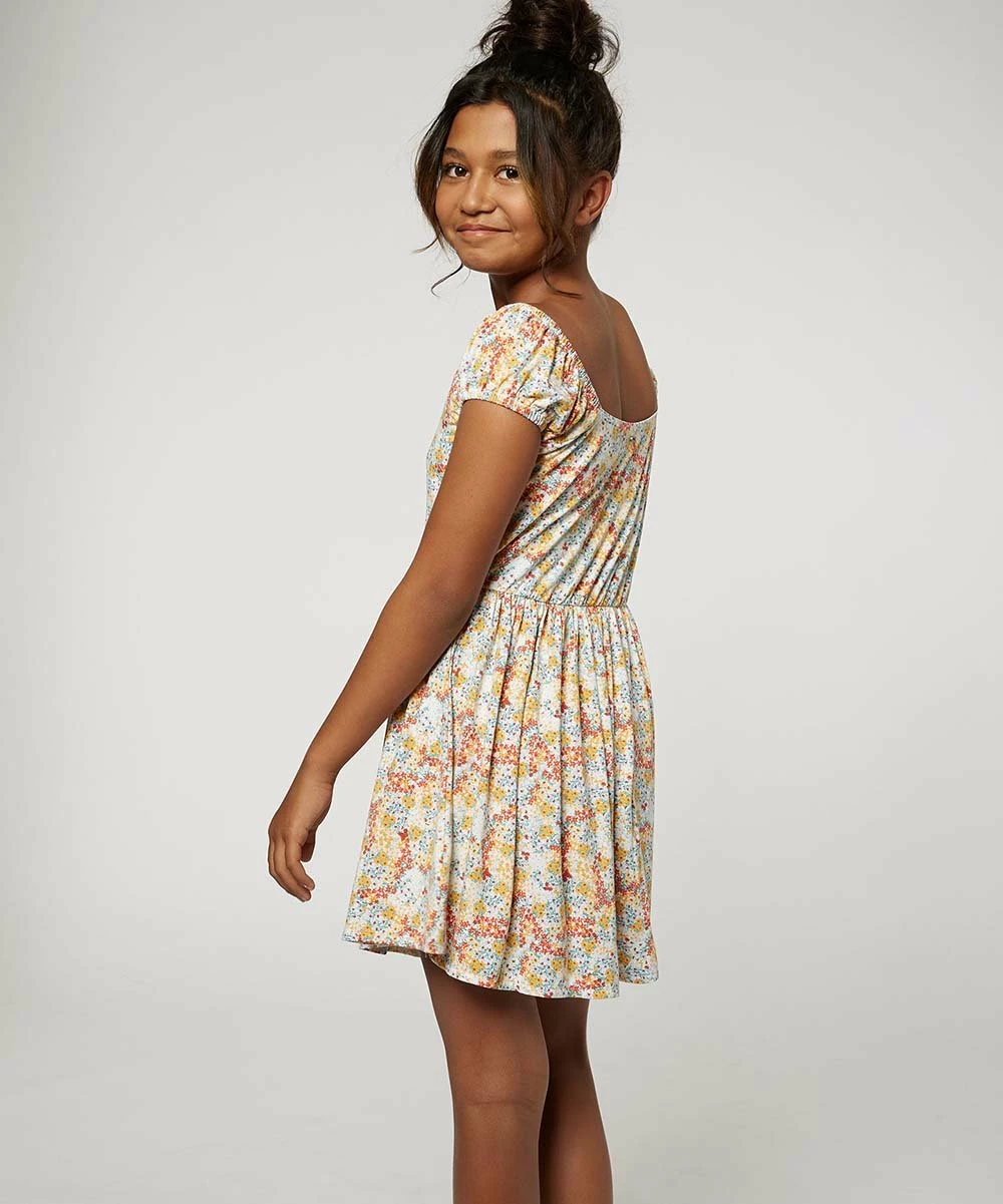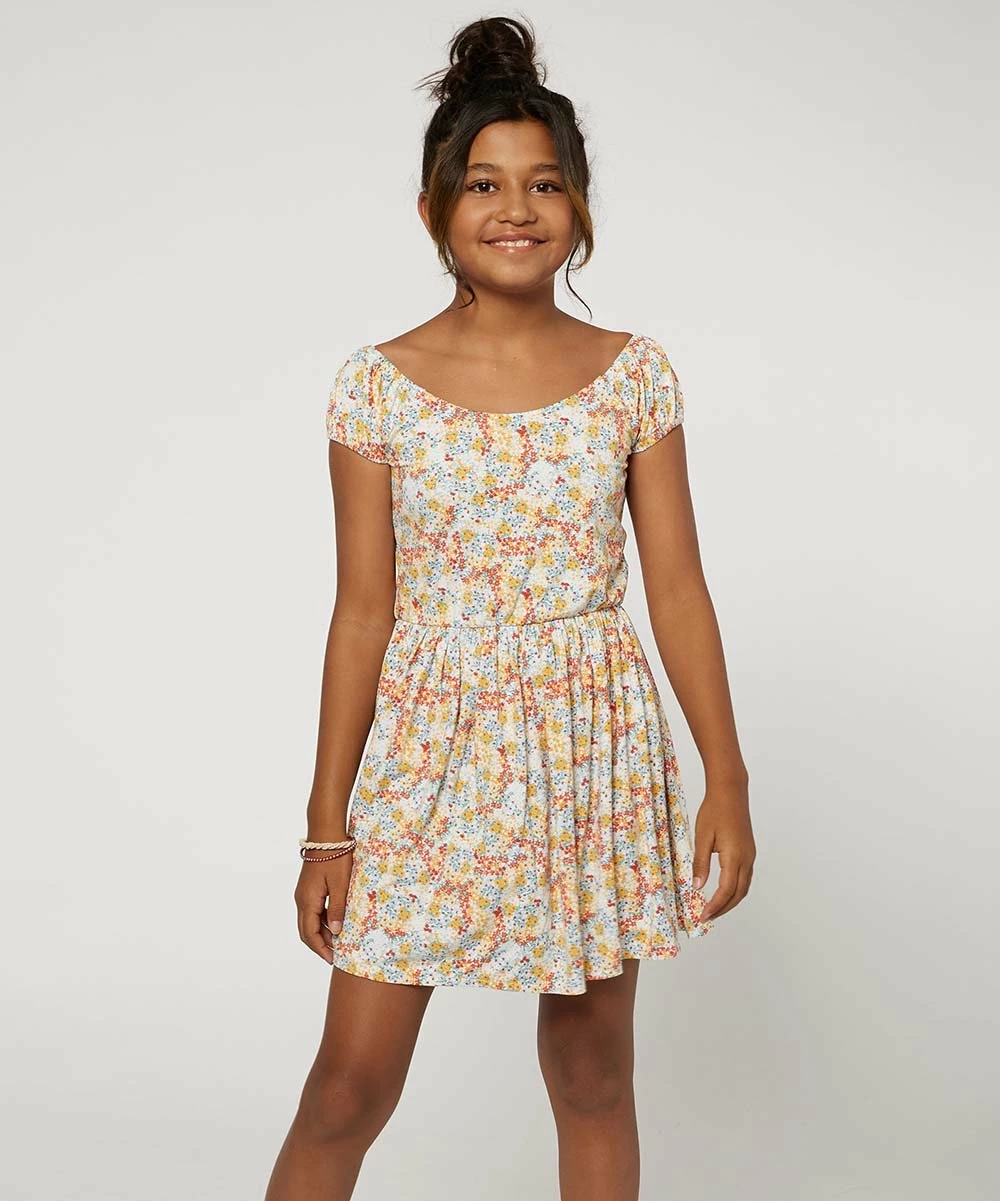 This flowy dress features a cool print and soft materials for everyday comfort.