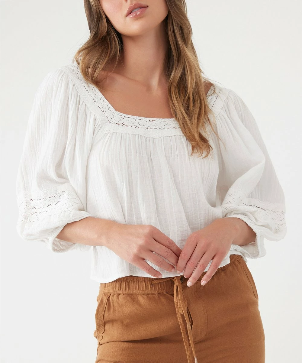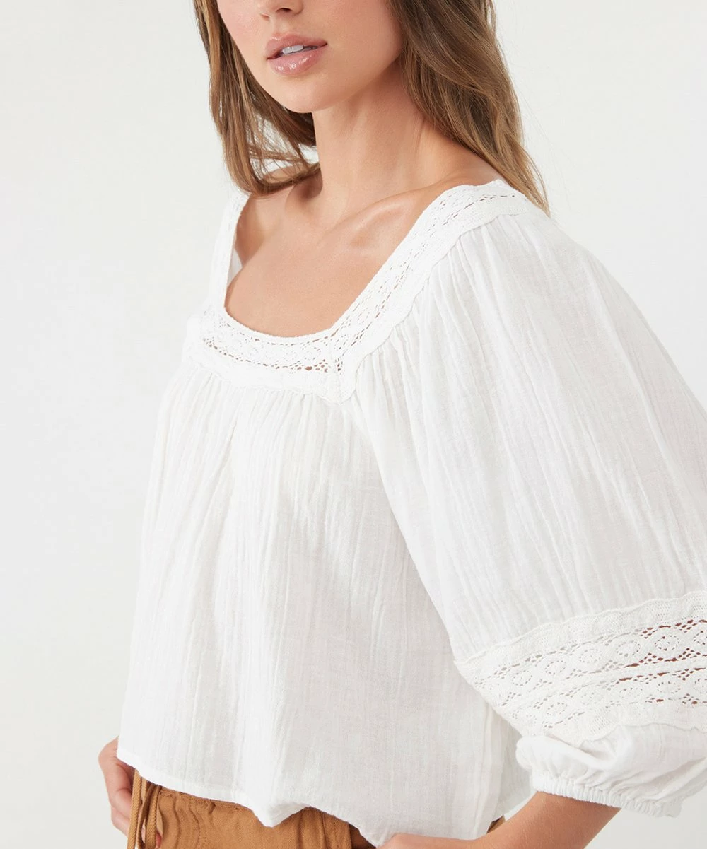 Square neck top featuring a versatile hue and crochet trim.