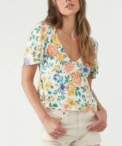 Best deal ๐ O’Neill Winter White & Yellow Floral Ribbed Weslin Flutter-Sleeve Top – Juniors ๐